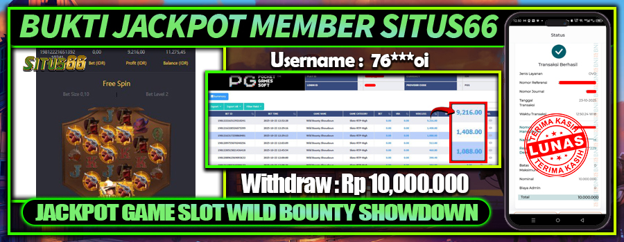 KEJAYAAN! MEMBER SITUS66 BERHASIL MERAIH JACKPOT GAME WILD BOUNTY SHOWDOWN! 23 OCTOBER 2025