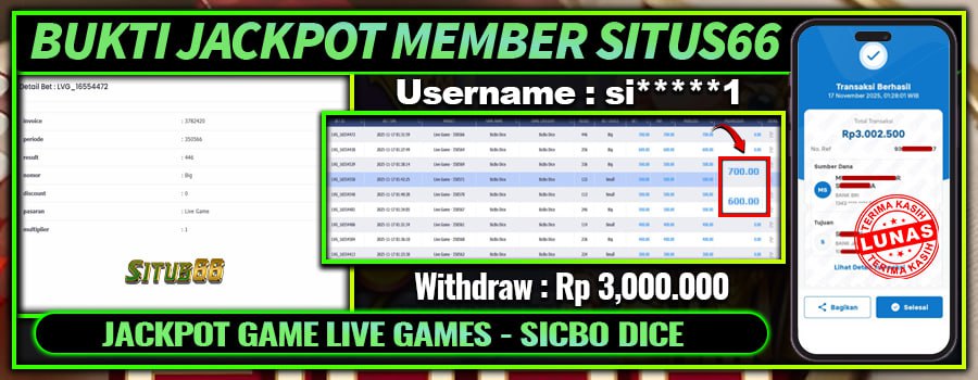 KEMENANGAN! MEMBER SITUS66 BERHASIL MERAIH JACKPOT LIVE GAME SICBO DICE! 18 NOVEMBER 2025